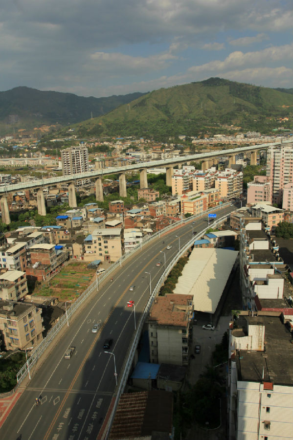 龍巖市東興高架橋位于龍巖市中心城區東北部,總投資9926萬元, 城市主干道Ⅱ級,為東興路東風橋至南環路段,該路段長約740米,屬城市內環線,車流量大,沿線與登高東路、鐵路、棋盤路及南環路相交,與鐵路平交處該路段高架橋上跨鐵路;在登高東路與東興路高架橋之間設置A、B、C、D匝道(均為單向單車道)利用4條匝道將既有登高東路與東興路相連,從而在東興路與登高路之間形成半苜蓿葉型互通式立交。高架橋全長461.77米,沿線與登高東路、漳龍鐵路、棋盤路及支小路相交,本工程采用高架上跨形式,跨越相交道路與鐵路,完全解決了與鐵路平交的安全隱患。橋梁上部結構采用(18.5+20+20)m普通鋼筋砼連續梁及25m、30m預應力砼空心板梁,橋面連續,下部采用樁接立柱接蓋梁橋墩與U型橋臺,墩臺基礎采用鉆孔灌注樁基礎。
