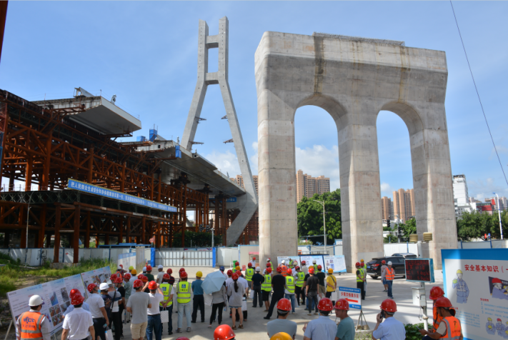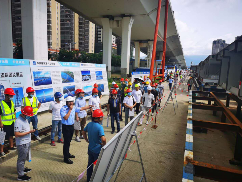 2020年6月28日,由龍巖城市發(fā)展集團(tuán)有限公司主辦,龍巖市政建設(shè)集團(tuán)有限公司(市城投公司)承辦,北京鐵研建設(shè)監(jiān)理有限公司、中國(guó)建筑第六工程局有限公司、中冶(上海)鋼結(jié)構(gòu)科技有限公司協(xié)辦的龍巖大道高架橋項(xiàng)目質(zhì)量安全標(biāo)準(zhǔn)化觀摩會(huì)在龍巖大道高架橋主橋鋼箱梁工程現(xiàn)場(chǎng)舉行。觀摩會(huì)分拼裝區(qū)域、提升站區(qū)域、頂推滑移區(qū)域、步履滑移區(qū)域及主橋轉(zhuǎn)體區(qū)域分別展示了龍巖大橋主橋鋼結(jié)構(gòu)拼裝、提升、弧形頂推滑移、步履滑移等新工藝及主塔“水平二次轉(zhuǎn)體”鋼箱梁頂推、斜拉索施工技術(shù)