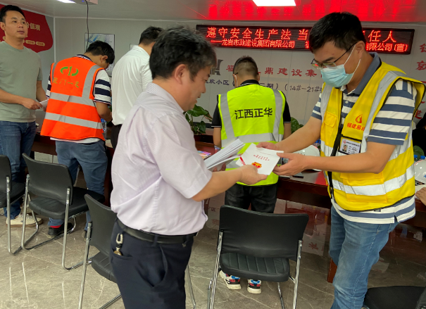 現場徐旺興董事長、修海金副總經理分別向項目部人員及工人現場分發《安全生產法》及“五進”等宣傳資料。